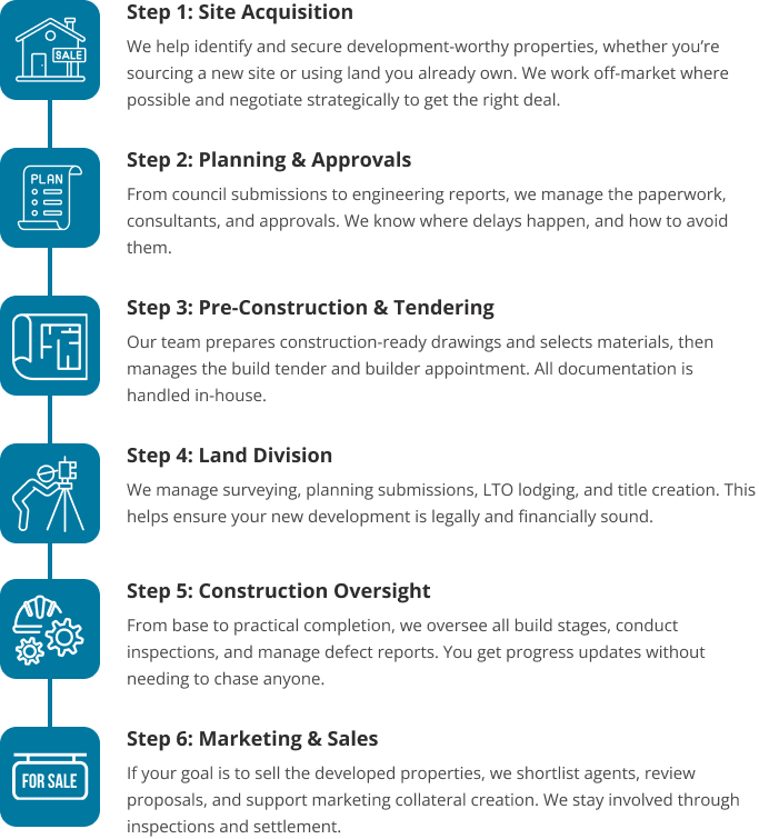 We provide end-to-end property development services designed to make the process profitable and low-stress. We handle the heavy lifting while giving you full transparency along the way.